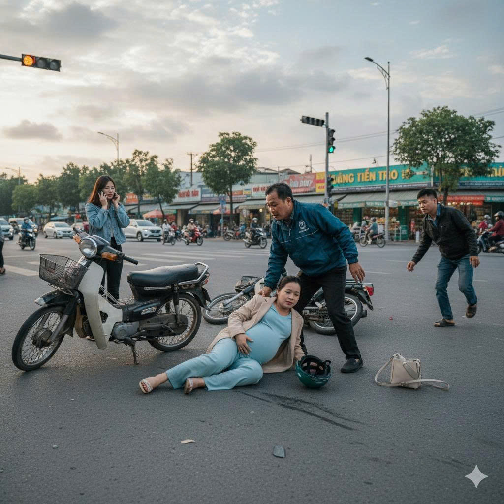 Đang đi giữa đường, bất ngờ chiếc xe máy phanh gấp tránh một ô tô vượt ẩu. Tôi bị hất mạnh, ngã quỵ xuống, nước ối vỡ tung trên nền đường loang lổ nước mưa. Người qua lại xôn xao, có người hét lên: