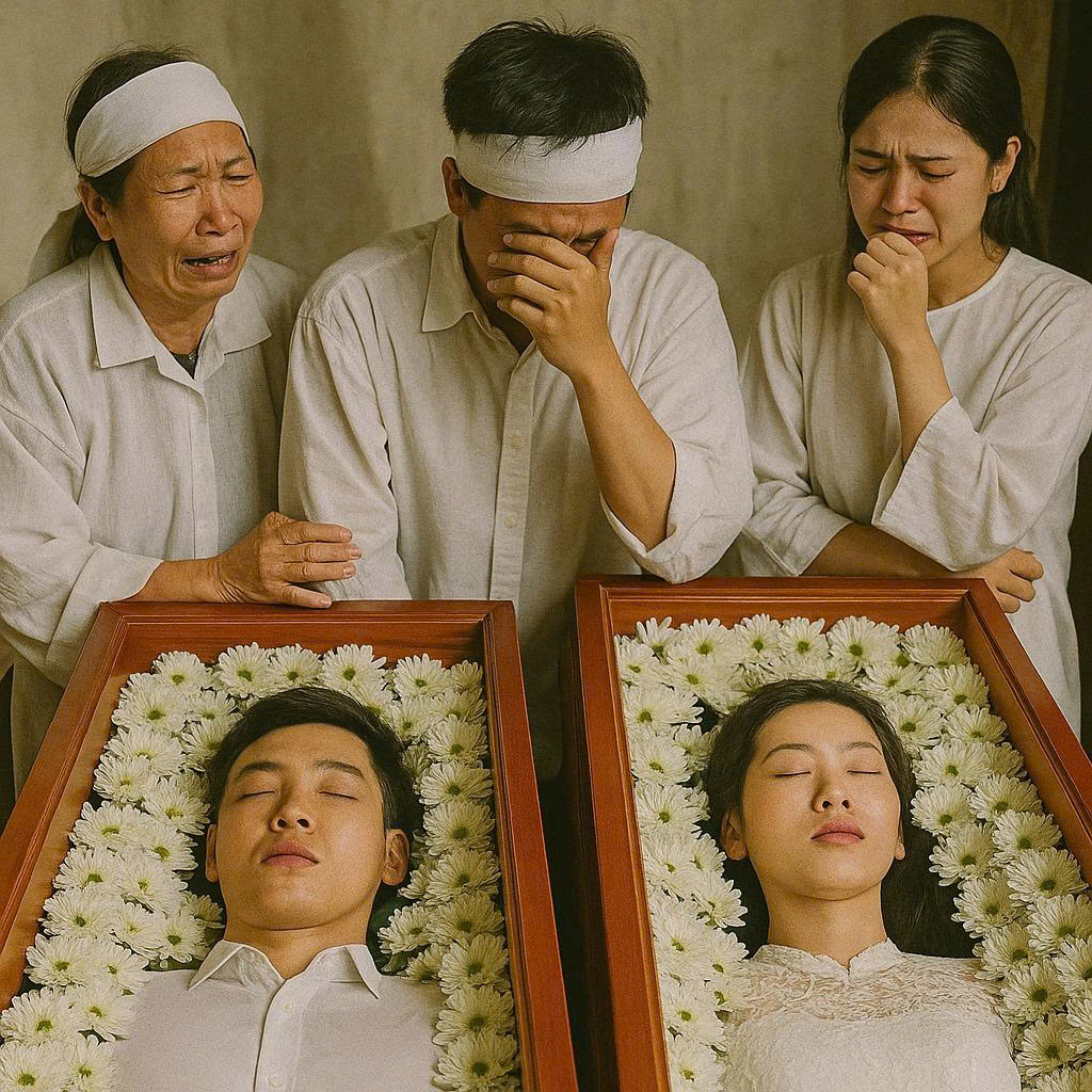 Sáng hôm sau, bầu trời u ám, mây đen giăng kín. Hai cỗ quan tài trắng đặt cạnh nhau, hương khói nghi ngút, không khí tang tóc lạnh người. Trong di ảnh, Cường mặc sơ mi trắng, nụ cười hiền. Trang trong áo dài hồng nhạt, ánh mắt sáng như ngày đầu gặp anh.